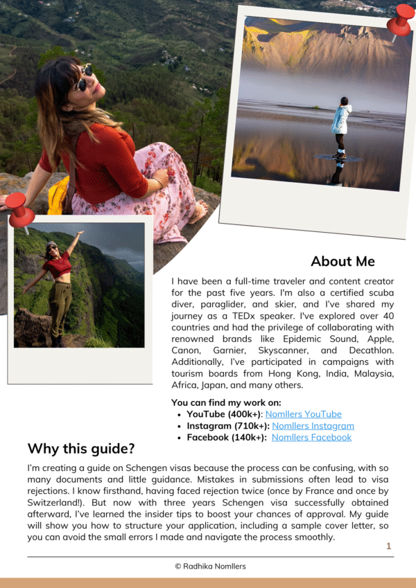 If you’ve ever felt overwhelmed or anxious about your Schengen visa, this guide will give you clarity, confidence, and tried-and-tested templates that have already proven successful. Hope you find value in it! For any feedback, you can email me at radhikasharma@nomllers.com